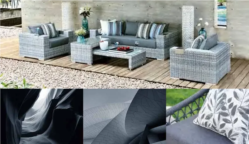 Los cojines de los muebles de exterior Artie están tapizados con tejidos 100% teñidos en masa con tratamiento repelente al agua y antimanchas.
